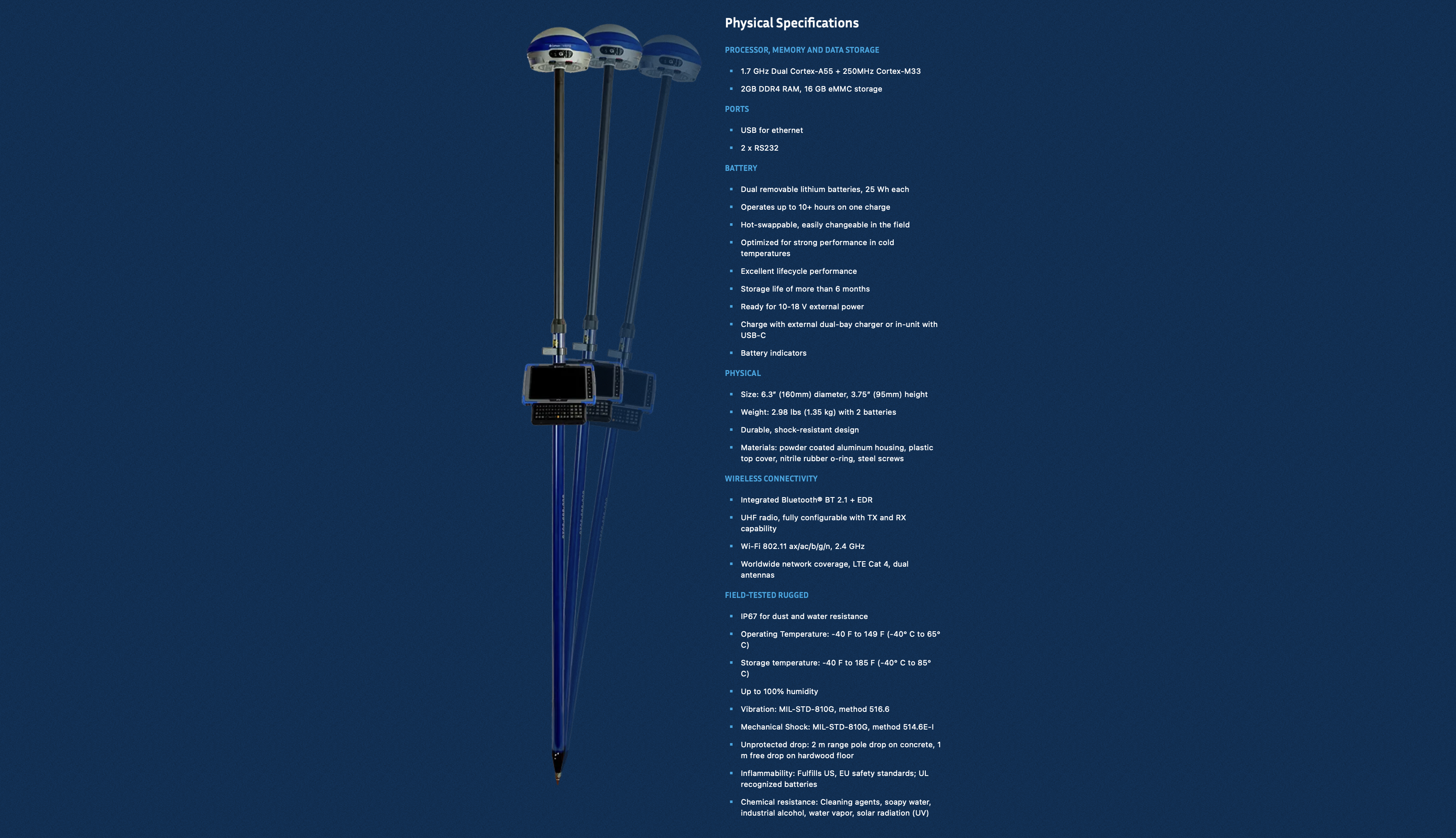 - Versatile & efficient: Use as a base or a rover with communication options including 400 & 900 MHz radio, internal mobile data modem, BlueTooth, and Wi-Fi